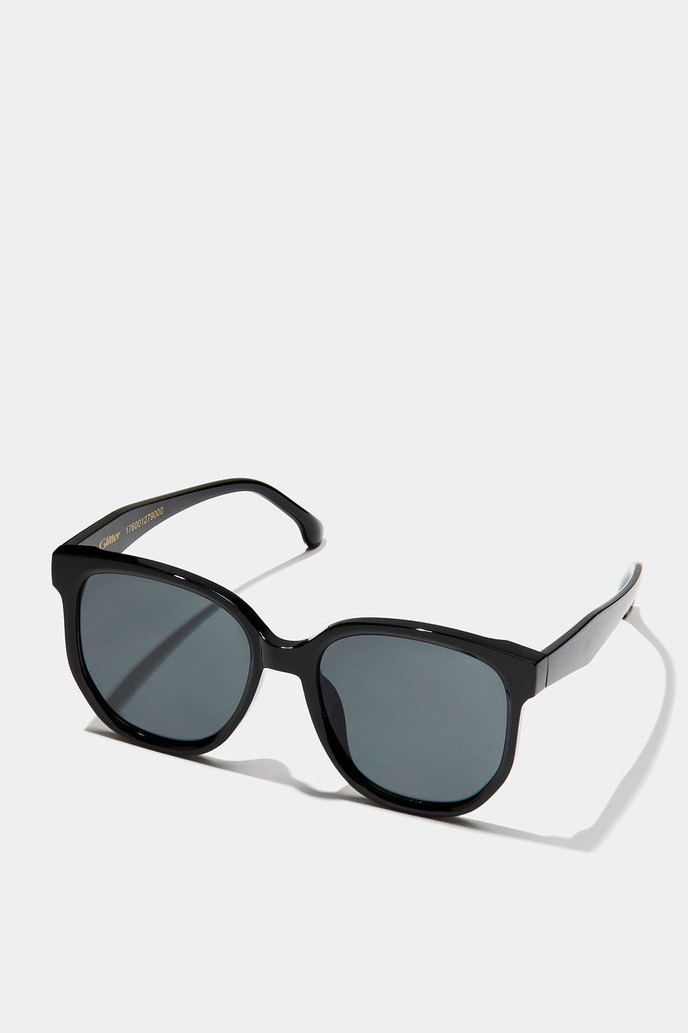Sorte solbriller med stor innfatning. Dels avrundet, dels kantet form. Perfekt tilbehør å ha med seg på en solrik dag og passer til alle anledninger.
