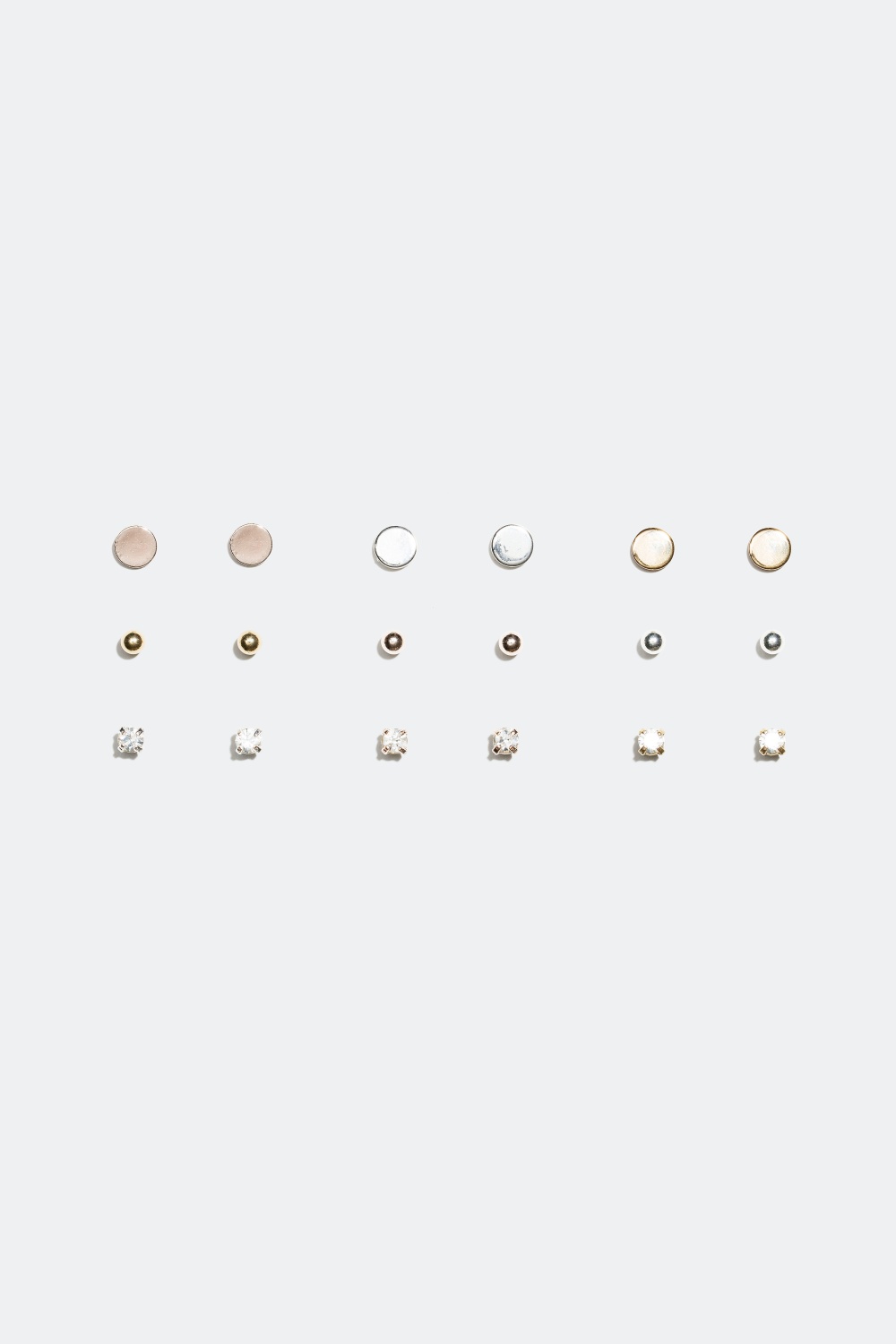 Ni studs med forskjellige former og overflater: tre par metallkuler, tre par flate sirkler, tre par med gjennomsiktige glassteiner. Seks par studs er i gyllent metall, og tre par studs er i sølvfarget metall.