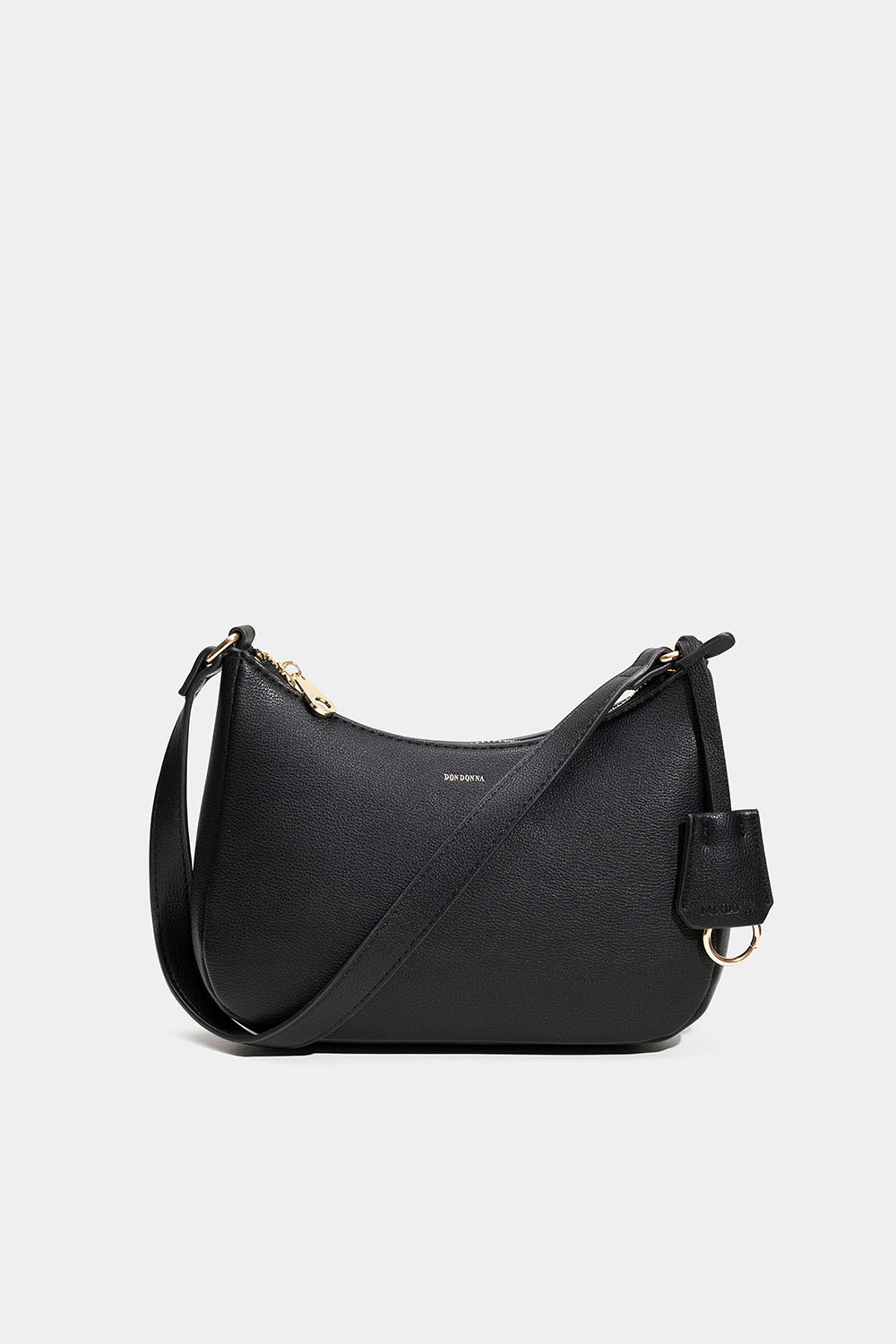Liten, svart baguetteveske fra Don Donna. Vesken har skulderrem, og lukkes med glidelås og to lommer inni hvorav det ene kan lukkes med glidelås. Den følger også med avtakbar nøkkelring.
