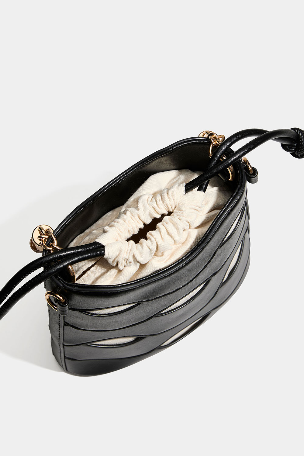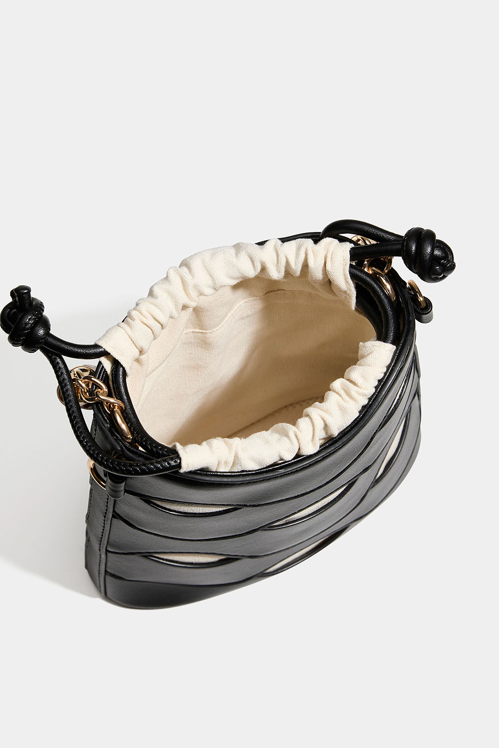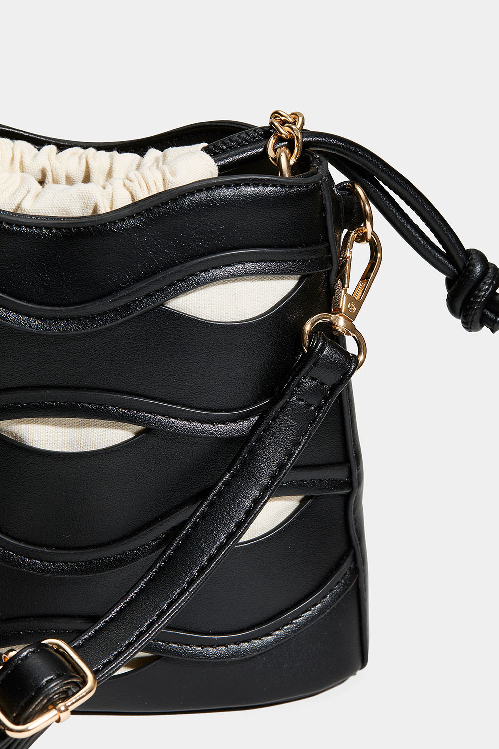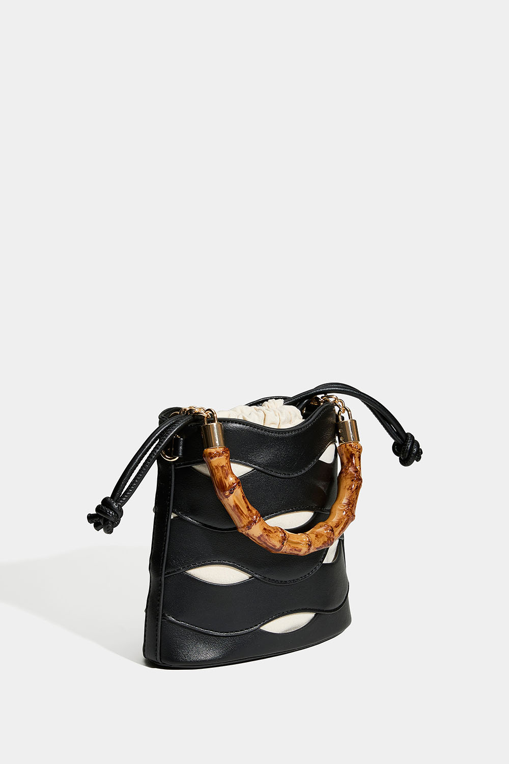 Svart bucketveske i skinnimitasjon med lys canvaspose inni med snøring. Bucketvesken har en bølget design med dekorative utskjæringer som gjør canvasposen synlig. Vesken har et kort topphåndtak med bambusmønster samt en avtakbar skulderrem.