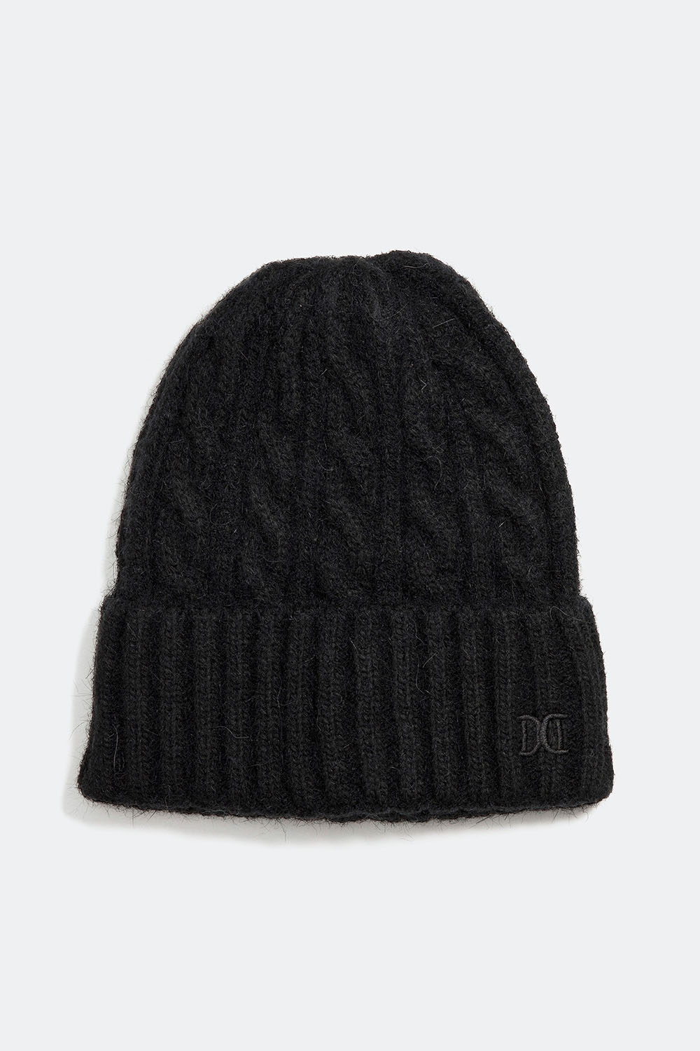 Svart, flettestrikket lue med oppbrett med Don Donna-logoen brodert i hvitt. En varm lue i tidløs design, som passer perfekt på kalde dager, et basisplagg i høst- og vintergarderoben.