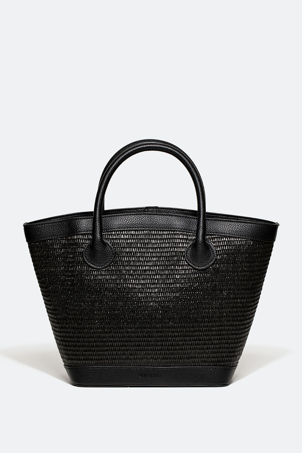 Svart stråveske i handlenettstil med Don Donna-logoen foran med. Den har både korte og lange håndtak i imitert skinn. En stilren veske som kombinerer mote og funksjon med ett stort rom og to små rom på innsiden.