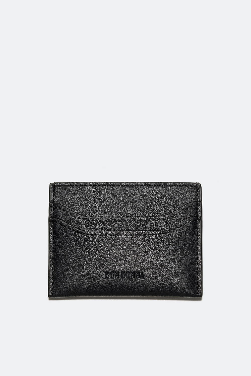 Stilren kortholder i svart kunstskinn med en Don Donna-logo preget på forsiden. En praktisk liten lommebok med to rom og et litt større rom i midten, til enten flere kort, kvitteringer eller sedler. En stilren kortholder med dekorativt mønster i perfekt størrelse til de viktigste kortene dine. Matcher perfekt våre Don Donna-vesker.