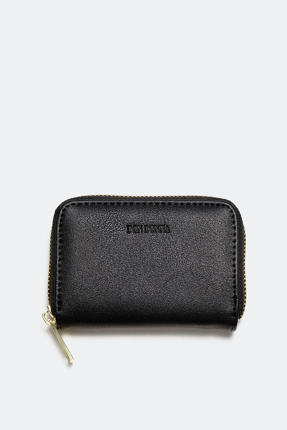 Lommebok i svart kunstskinn for kort og sedler med en Don Donna-logo preget på forsiden. Praktisk liten lommebok med små rom til kort. Lommeboken lukkes ved hjelp av en glidelås, dermed oppbevares kortene dine trygt på plass. Stilren lommebok som matcher perfekt våre Don Donna-vesker.