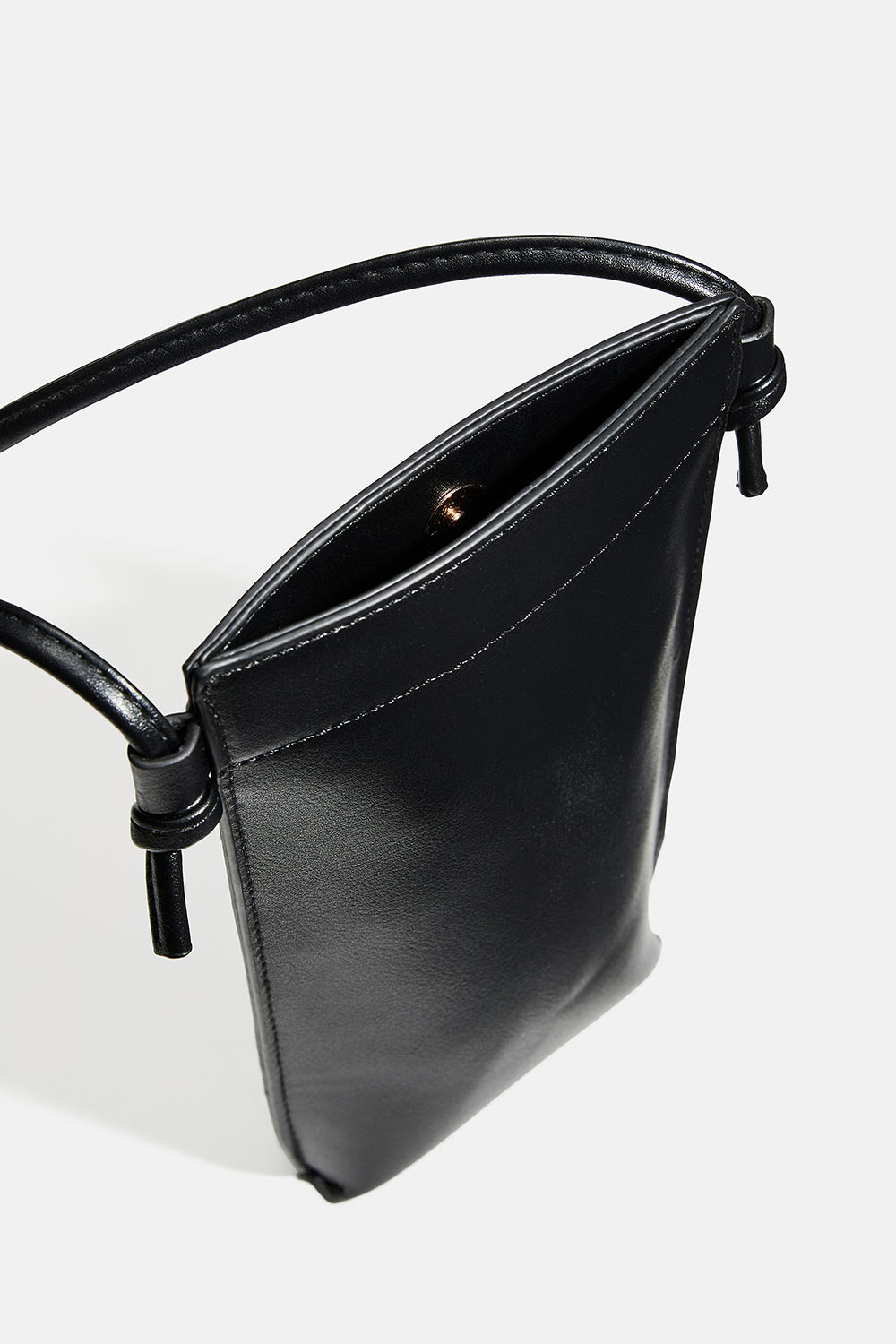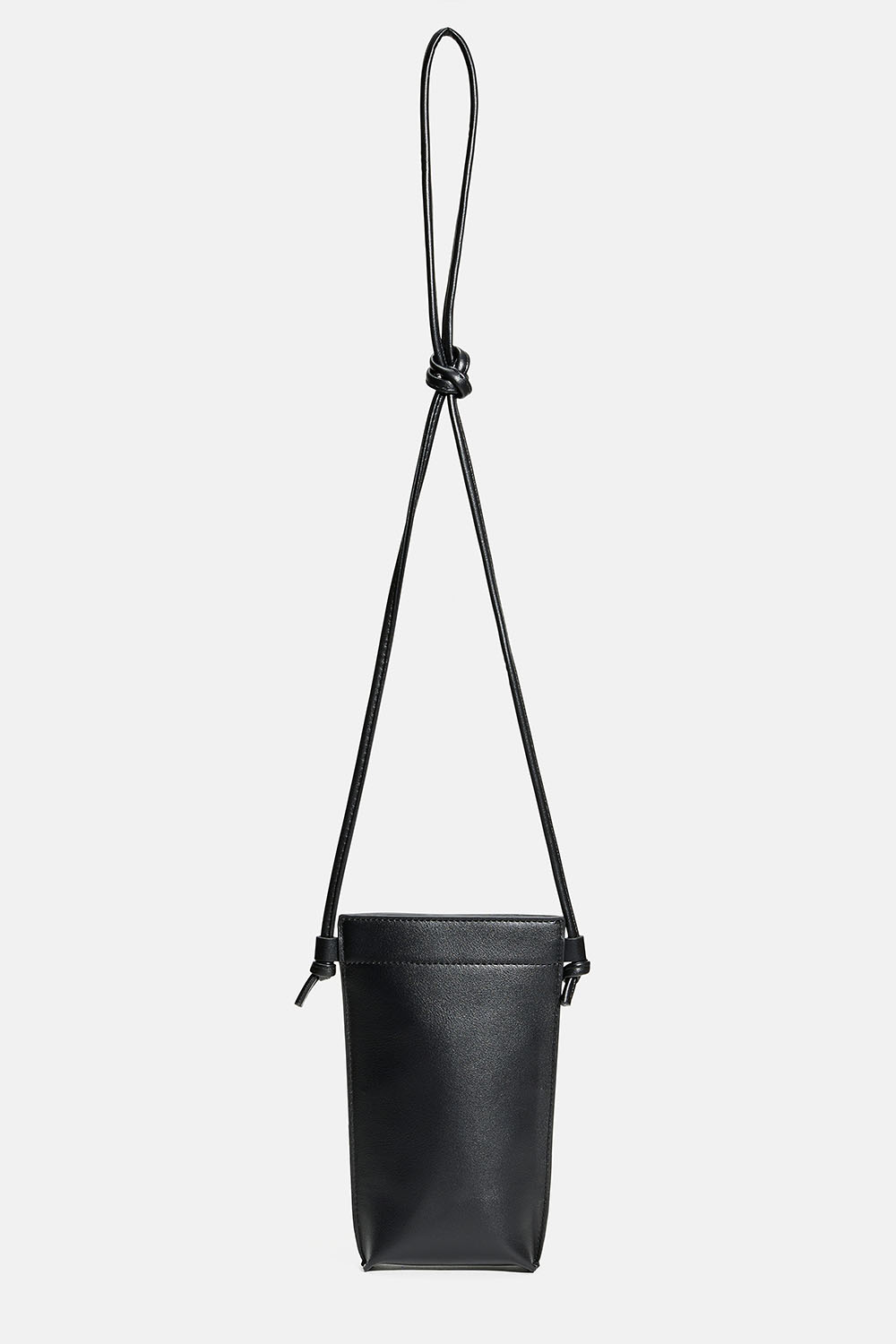 Stilren mobilveske i svart skinnimitasjon med magnetlukning. Kan brukes på flere måter: rundt halsen, på skrå eller over skulderen.