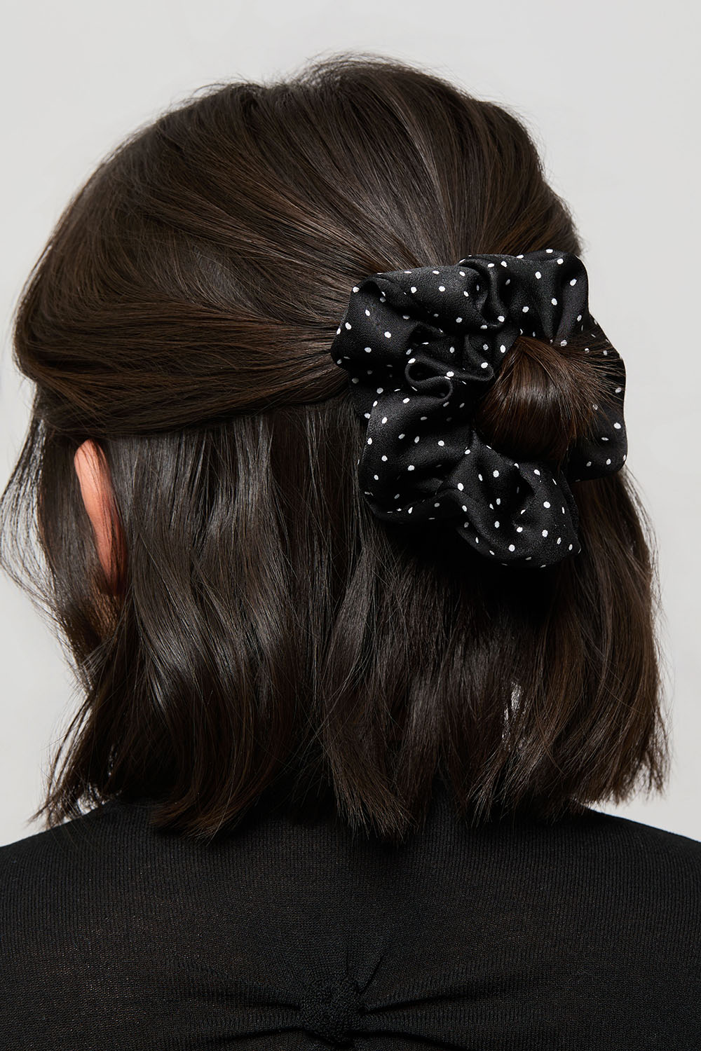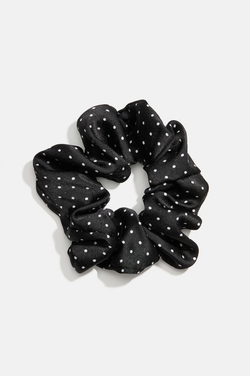 Scrunchie i svart silkeimitasjon med små hvite prikker.