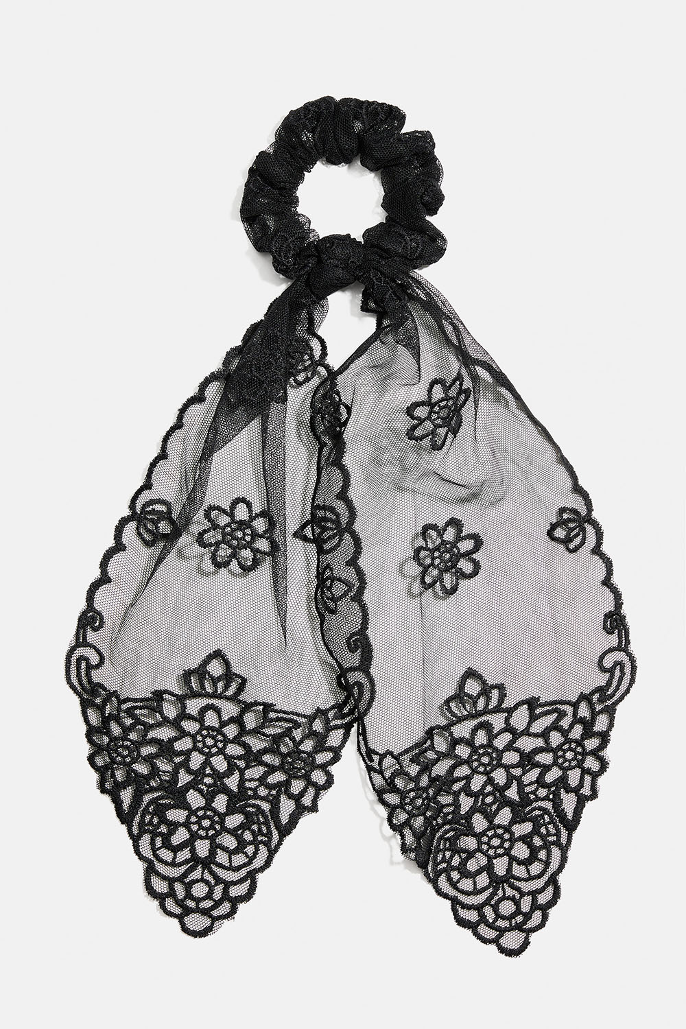 Scrunchie med sløyfebånd med svarte blonder. En fin detalj som gir en illusjon om at man har knyttet et skjerf rundt håret.