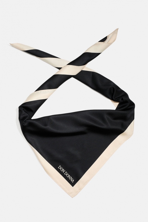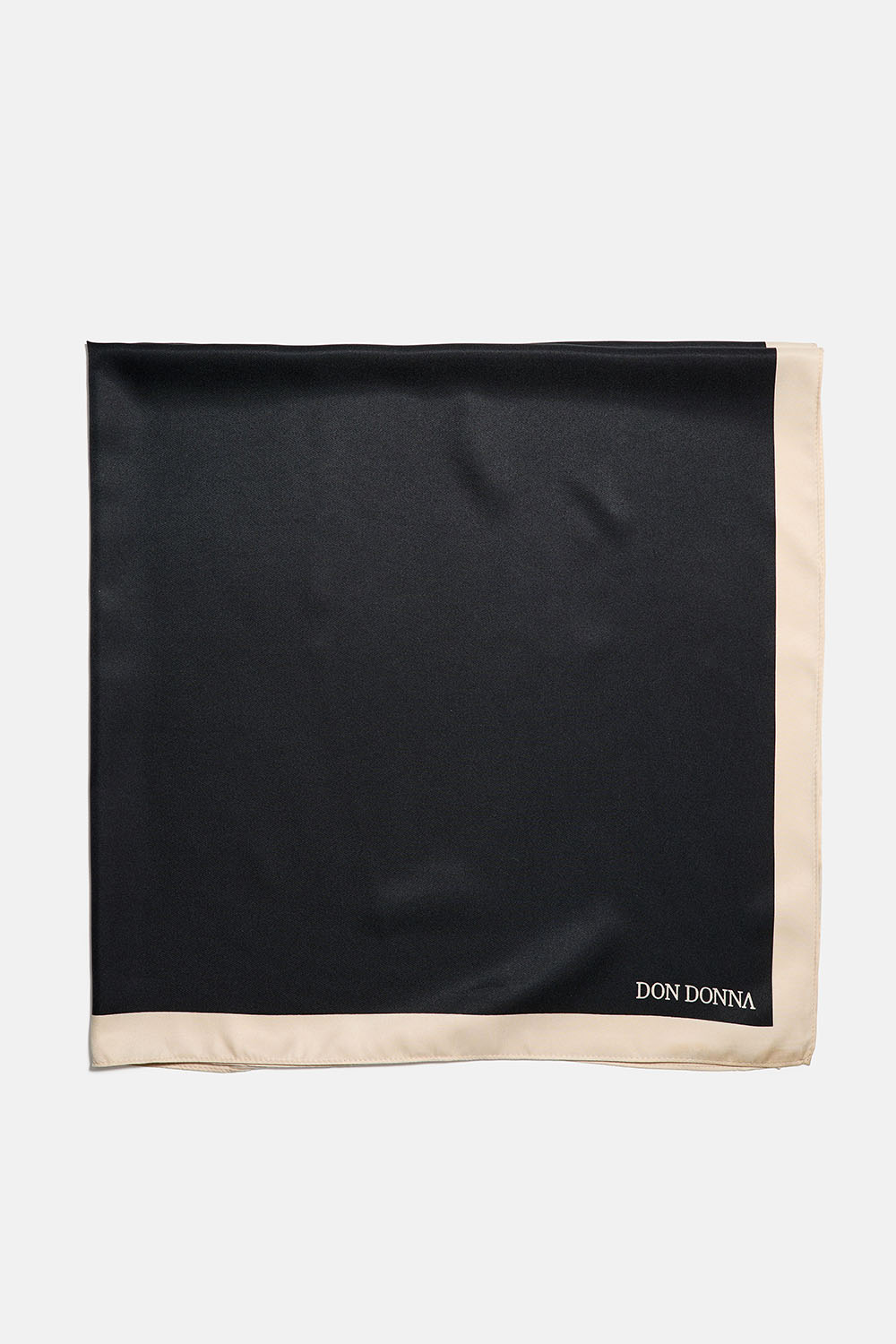 Firkantet skjerf fra Don Donna i svart imitert silke med hvite kanter.