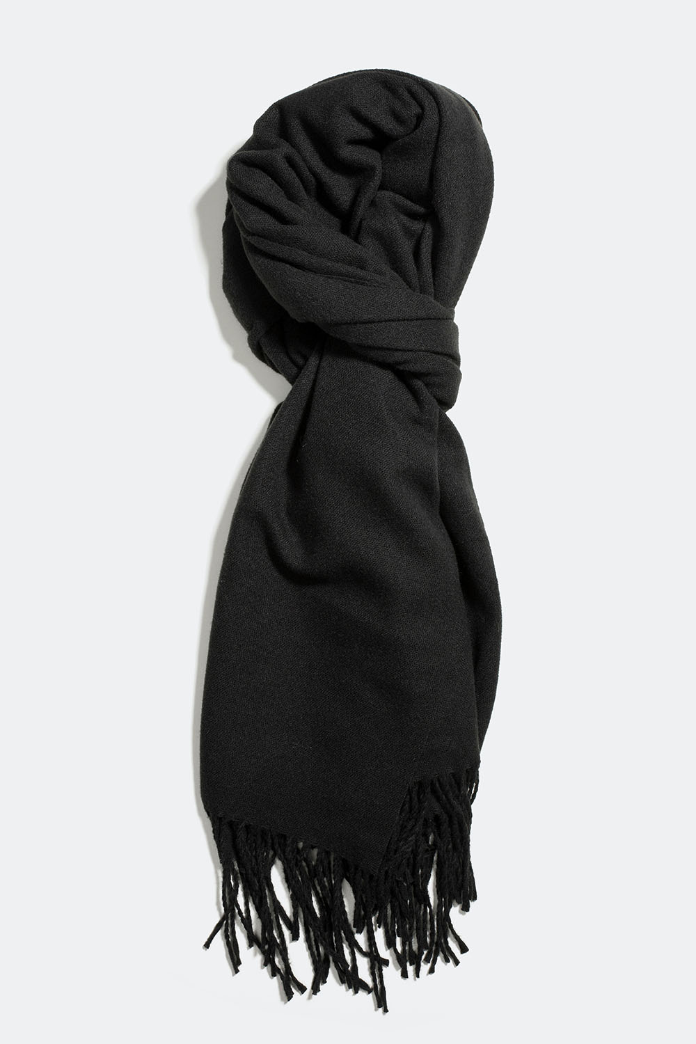 Svart skjerf med frynser i et tynt, mykt materiale. Perfekt accessoir til kalde dager om høsten.