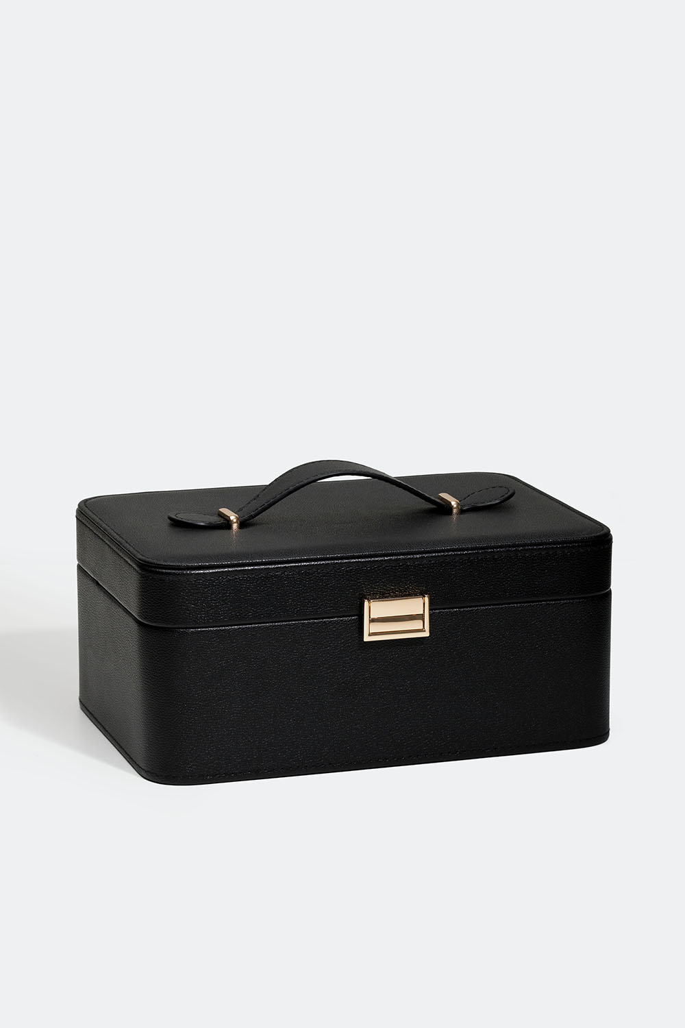 Smykkeskrin i svart kunstskinn med håndtak og speil samt bomullsfløyel på innsiden. Et stort og praktisk smykkeskrin som er delt i to lag med smart oppbevaring til alle favorittsmykkene dine.
