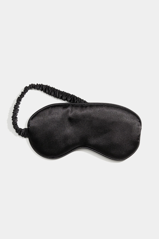 Lett vattert sovemaske i svart sateng med elastisk bånd som festes rundt hodet.