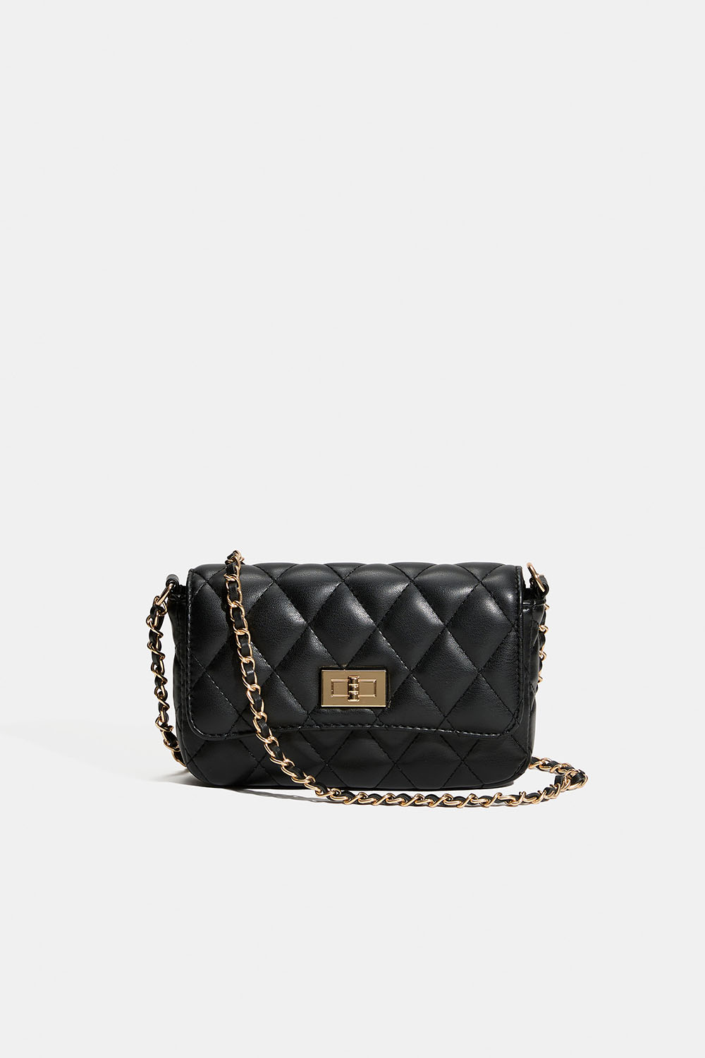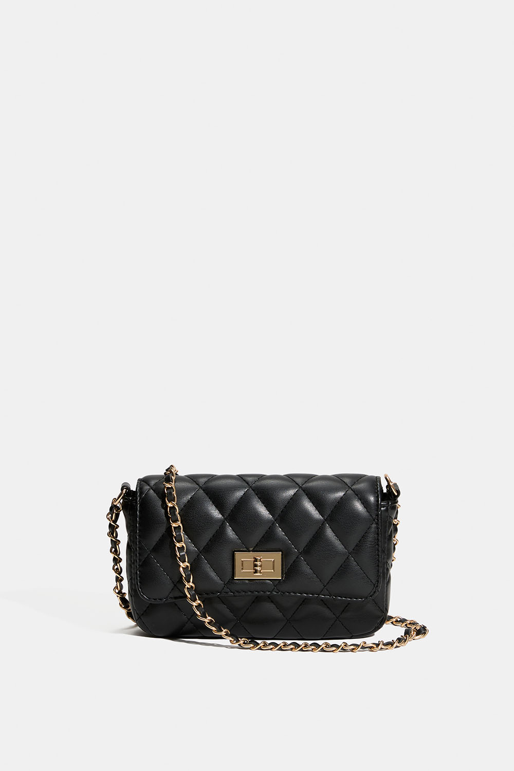 Liten skulderveske i rektangulær design i svart vattert kunstskinn. Vesken kan også bæres som en crossbody. En stilren veske med gyllen skulderrem pyntet med svart imitert skinn. Det store rommet lukkes med magnetspenne, inni er det et mindre rom med glidelåslukking. En perfekt størrelse til fest, med plass til det viktigste du trenger å ha med deg.