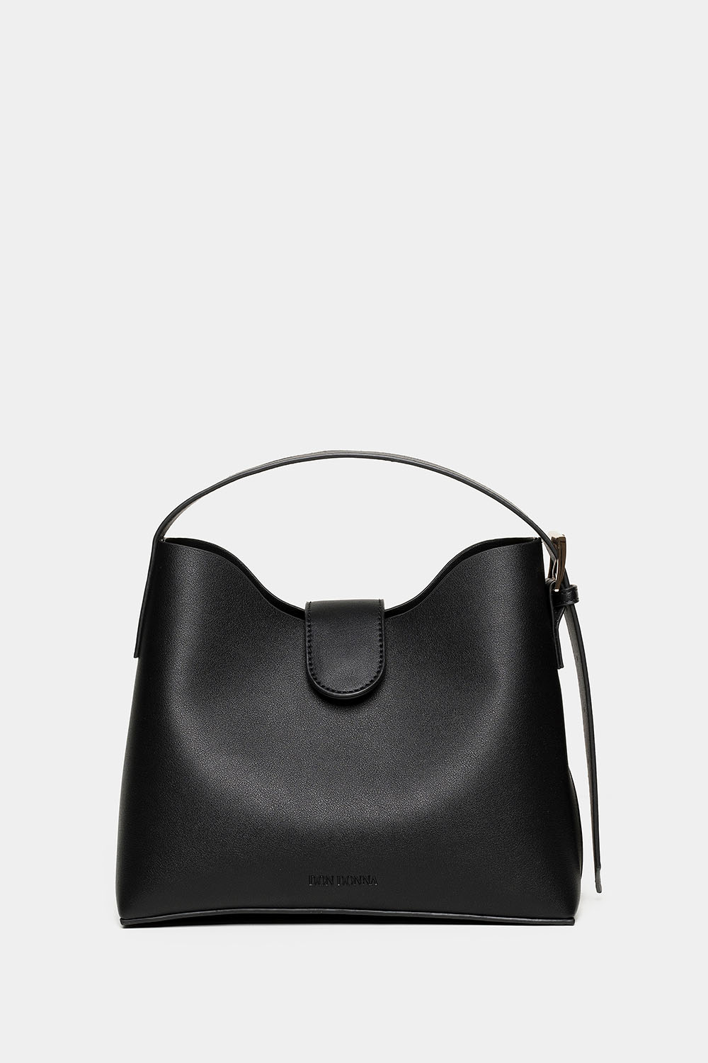 Svart veske med preget Don Donna-logo foran. En stilren veske med bred justerbar rem og en lengre avtakbar skulderrem. Vesken har en en mindre veske inni. Perfekt hverdagsveske og accessoir til jobb eller bytur. Skulderremmen er avtakbar og justerbar, slik at vesken kan bæres over skulderen eller som crossbody.
