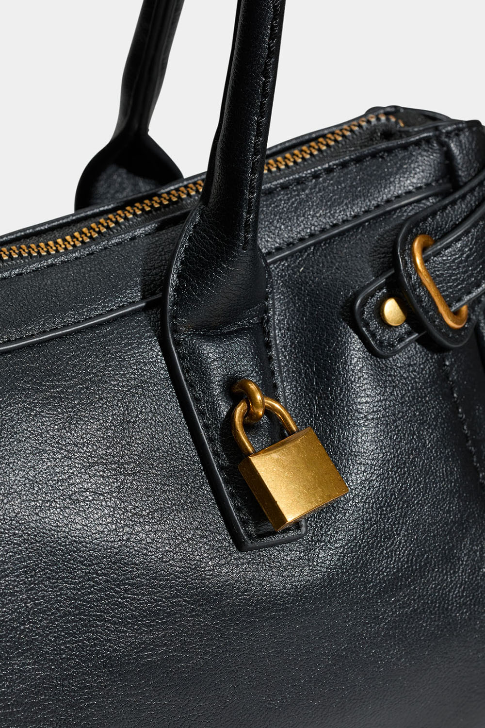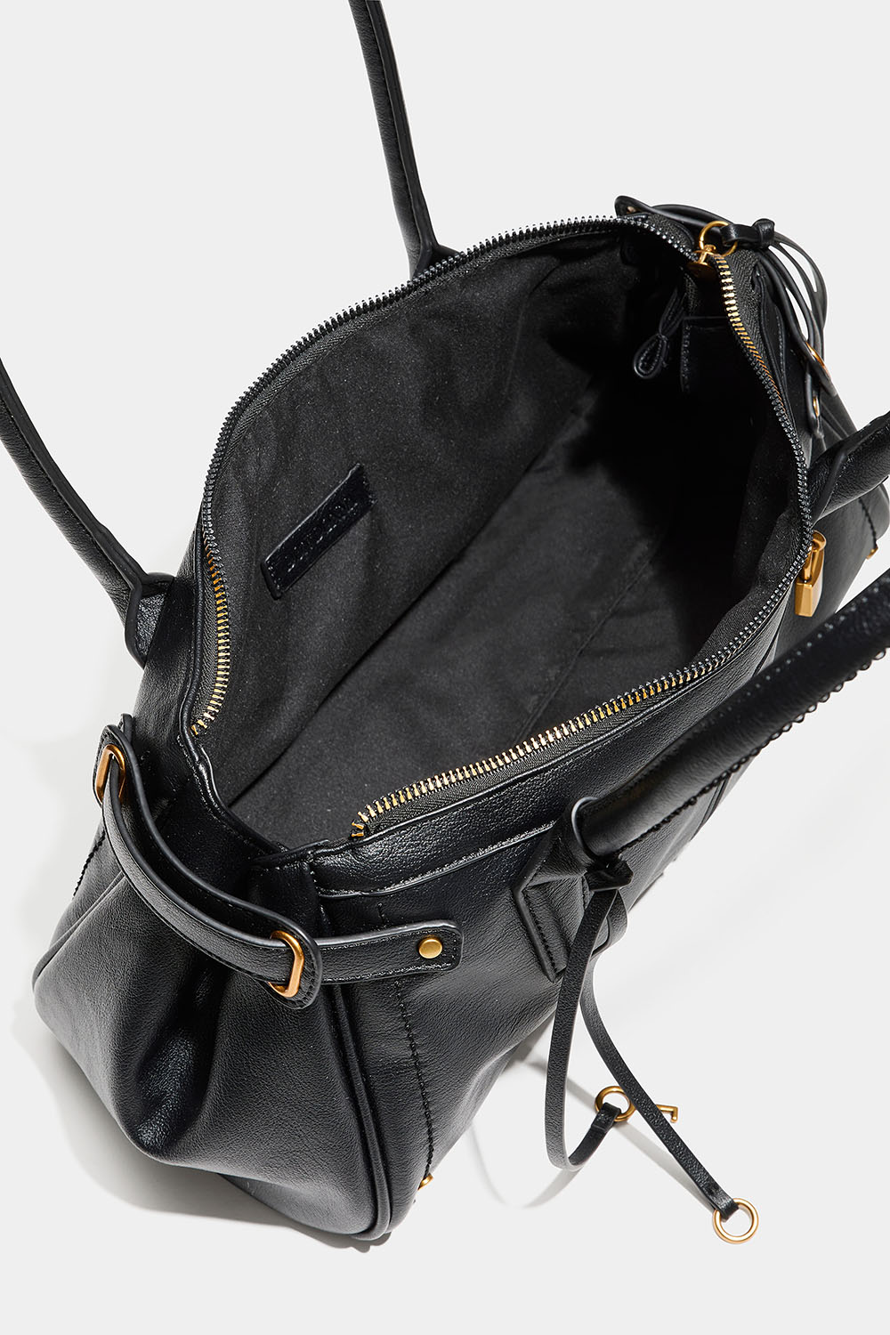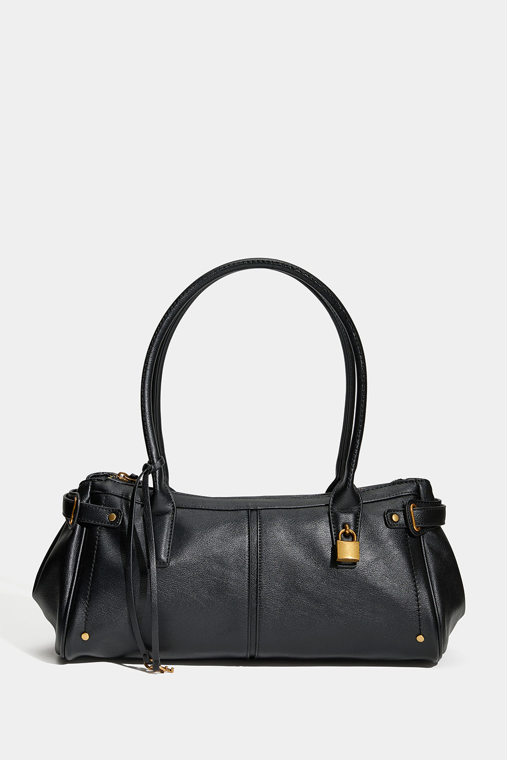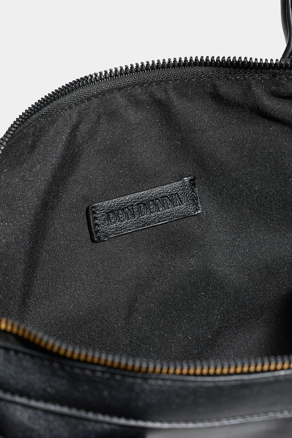 Svart veske i imitert skinn fra Don Donna med lange skulderremmer og et avlangt design med Don Donna-logoen preget foran. Vesken fås med lås- og nøkkeldetaljer i matt gullfarget metall. Lukkes med glidelås, dekorert med remmer.