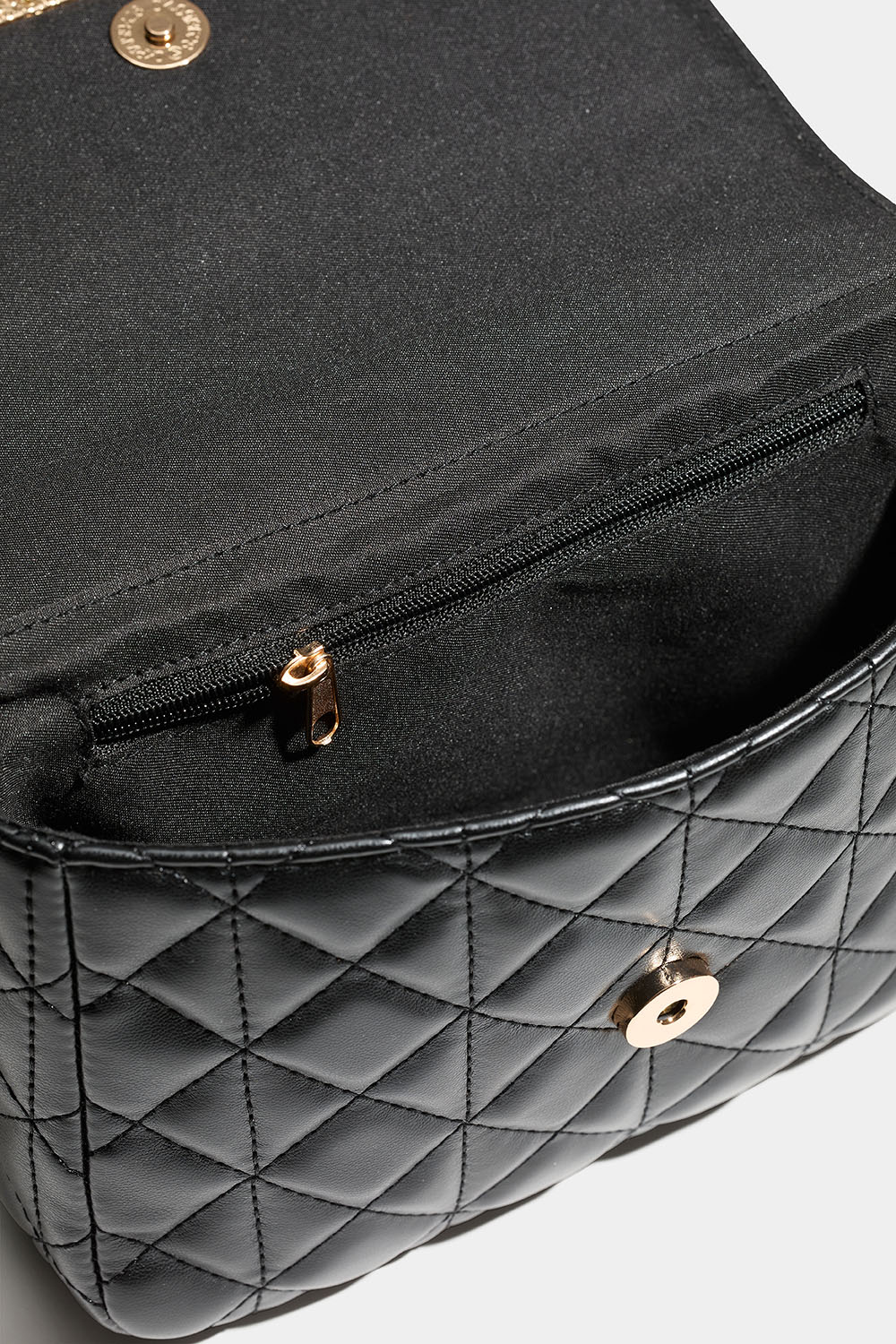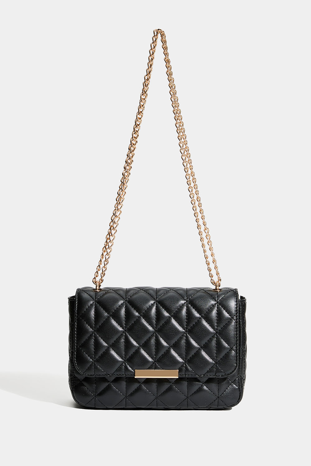 Svart veske med quiltet design og gullfarget skulderrem med kjede. Du kan enten brette kjeden for en kortere skulderstropp, eller som en lengre – og da kan vesken også bæres på tvers. Vesken lukkes med en magnetknapp og har et lite innerrom som lukkes med glidelås.