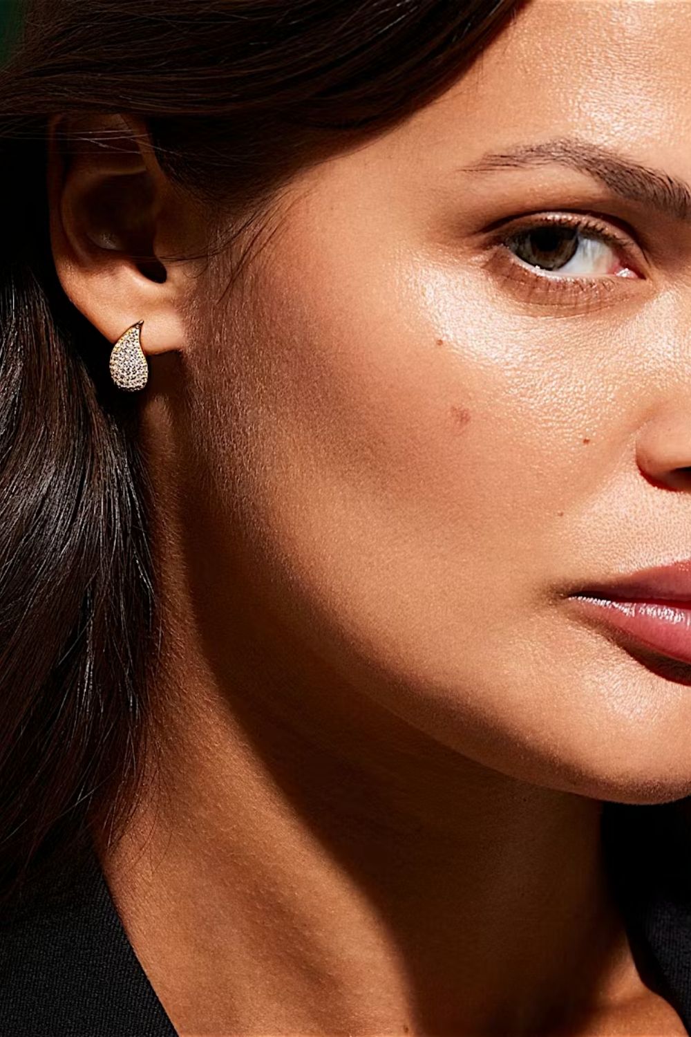 Dråpeformede øredobber pyntet med klare Cubic Zirconia-stener, forgylt med ekte 24k gull og med en kjerne av ekte sterlingsølv 925.