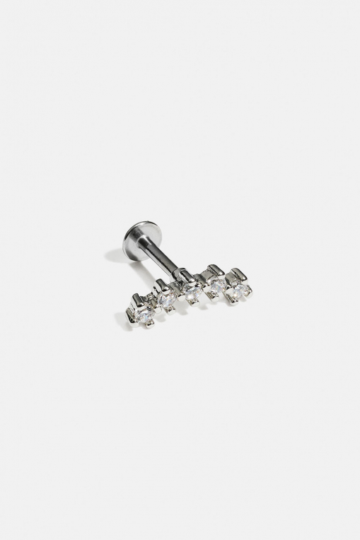 Traguspiercing med flatt bakstykke i kirurgisk stål, med bøyd stang dekorert med Cubic Zirconia-steiner. Dette piercingsmykket er beregnet til å sitte i den lille bruskfolden foran øregangen, men den kan også brukes i andre ørepiercinger, som helix.