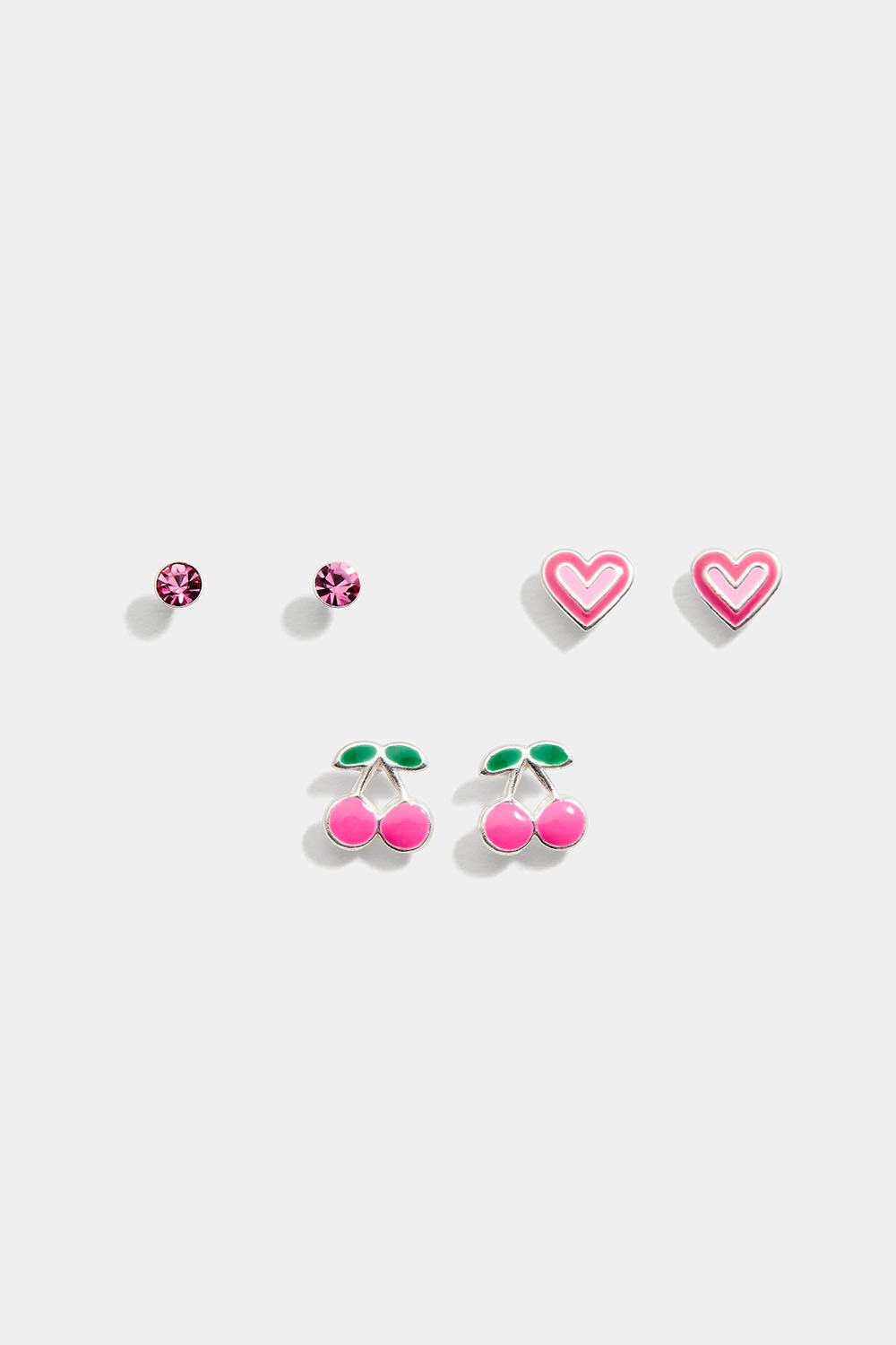 Tre par øredobber i sterling sølv med rosa stein, hjerter og kirsebær i gruppen Barn / Barnesmykker / Barneøredobber hos Glitter (405000195400)