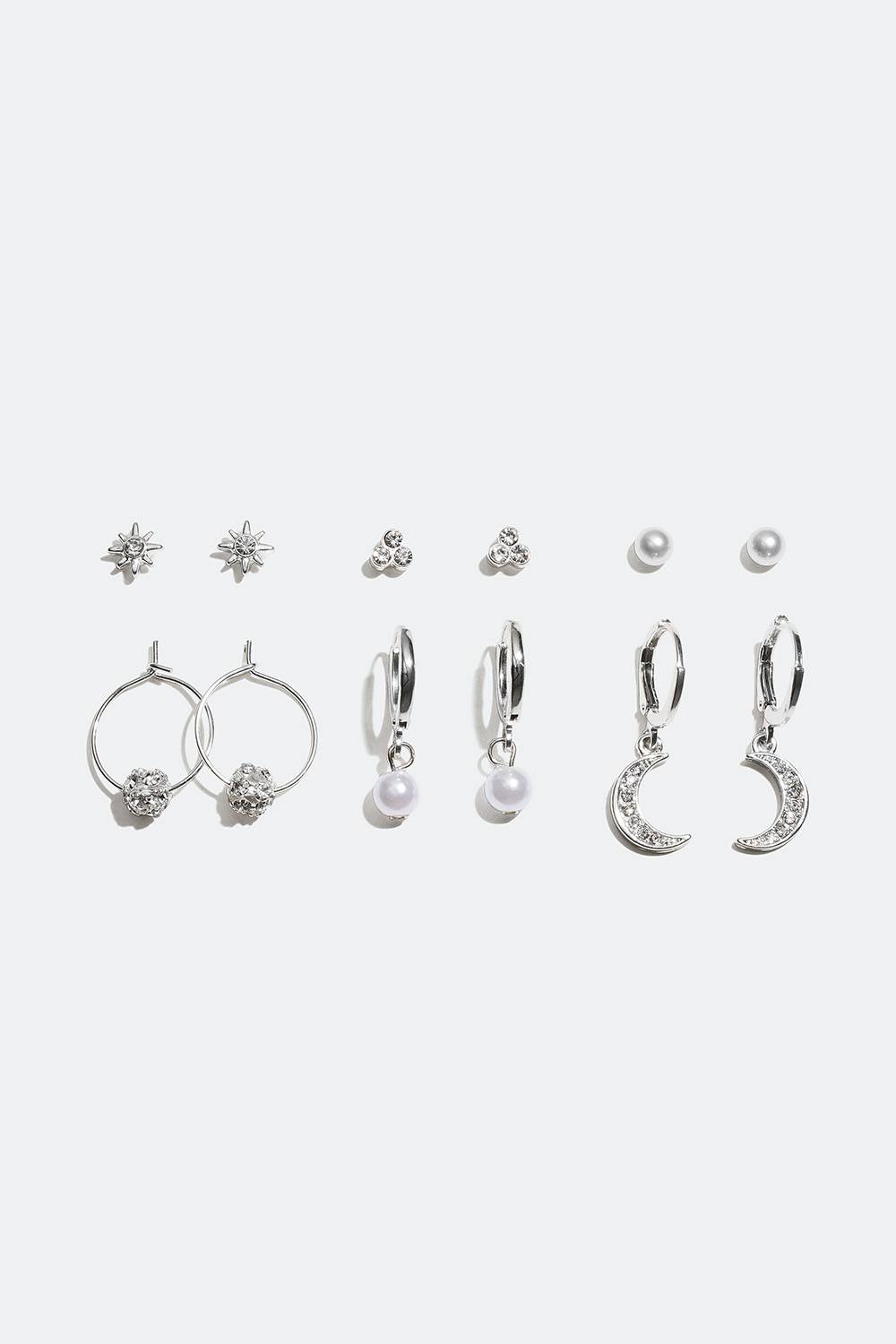 Tre par studs: hvite perler, stjerne og trekant med glassteiner i gruppen Smykker / Øredobber / Flerpakning hos Glitter (326753011000)