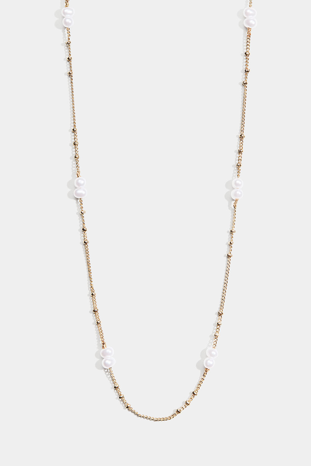 Halskjede i gullfarget metall med vekselvis små, sølvaktige perler og ovale, hvite perler.