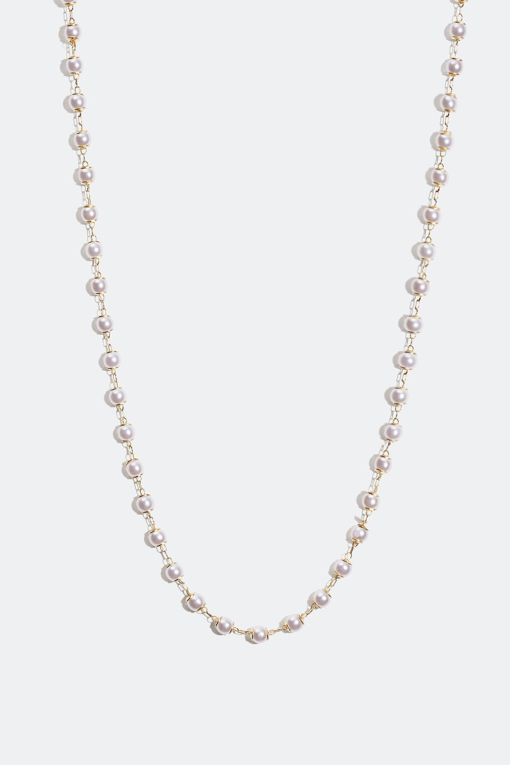 Halsbånd med perler. Et tynnere perlekjede med små, hvite plastperler som er festet med litt avstand langs kjedet. Klassisk smykke og en elegant detalj til antrekket ditt. Passer perfekt til både hverdags og fest.
