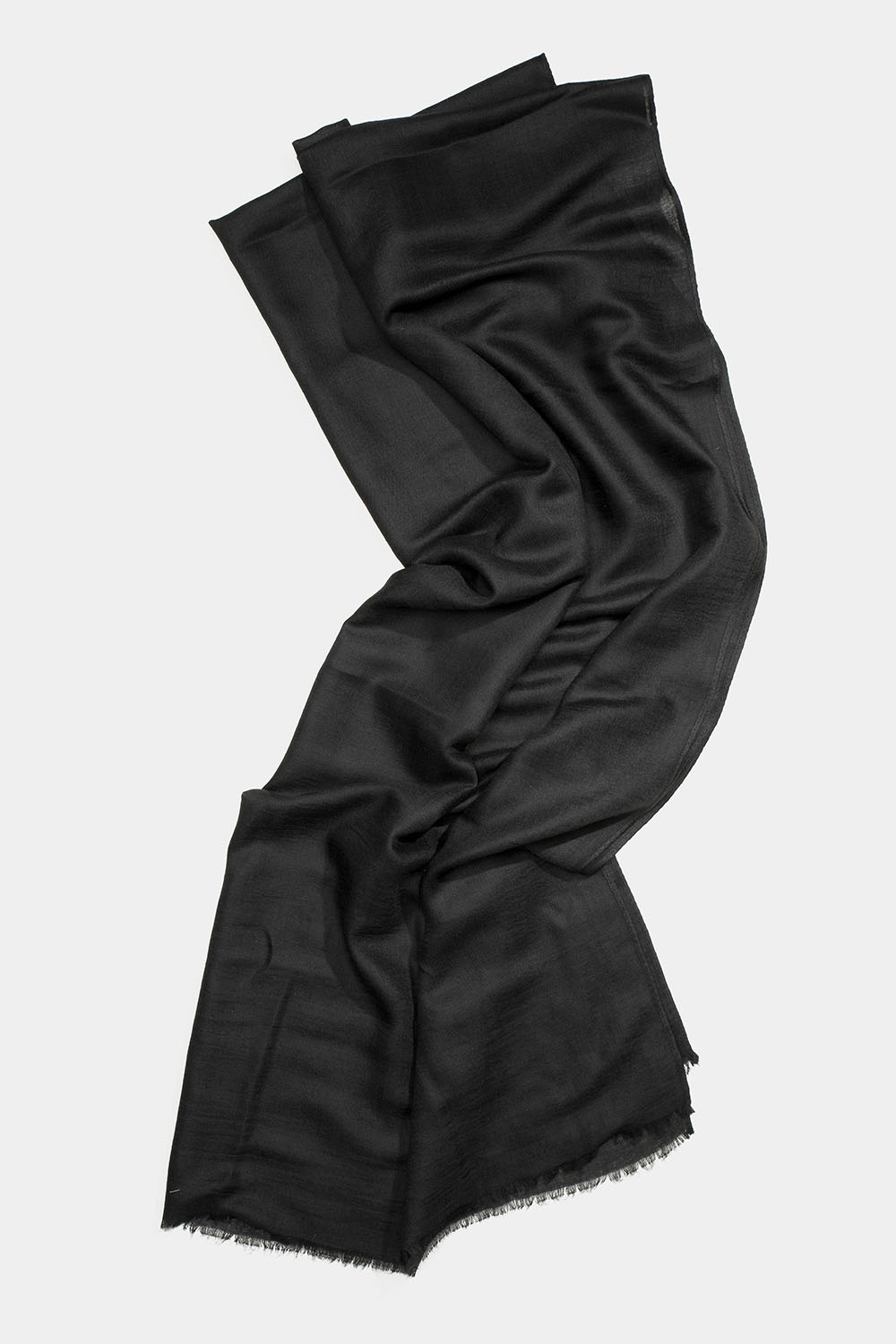 Lett og mykt svart skjerf. Skjerfet er bredt og like deilig å knyte rundt halsen som å ha over skuldrene. Det er i et finstrikket og lett materiale som er pyntet med korte frynser langs sidene.