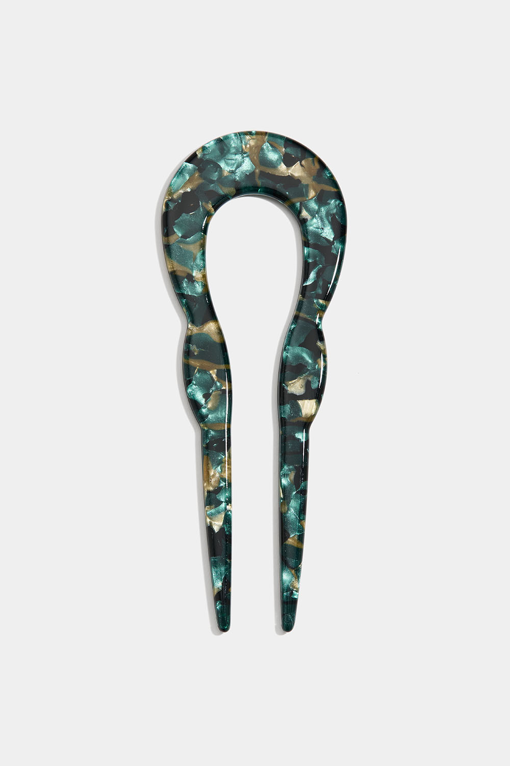 En grønnmelert U-formet fransk hårnål i harpiks.