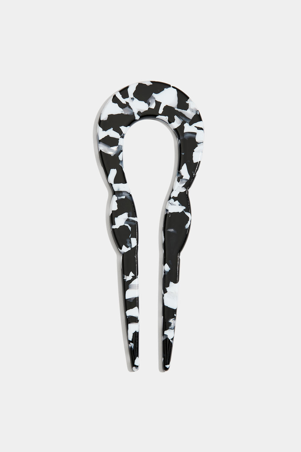 En sort og hvit U-formet fransk hårnål i harpiks.