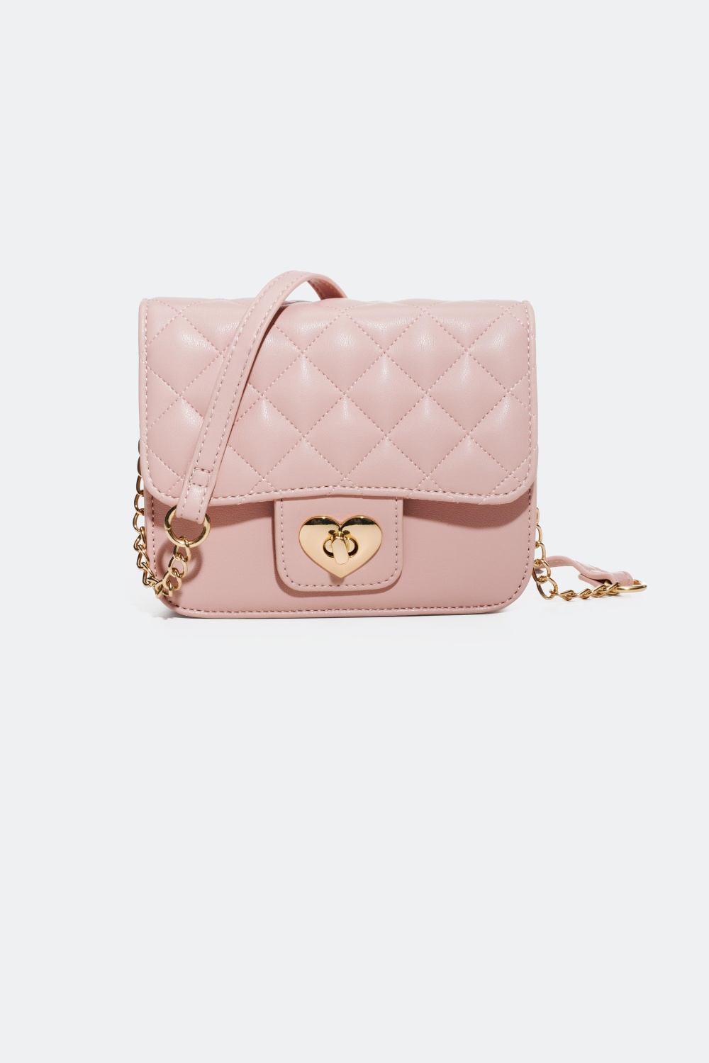Søt skulderveske med vattert lokk og gullfarget hjerteformet lås. Vesken fås i en lyserosa farge og har en skulderrem formet som et gullfarget kjede med lyserosa detaljer.