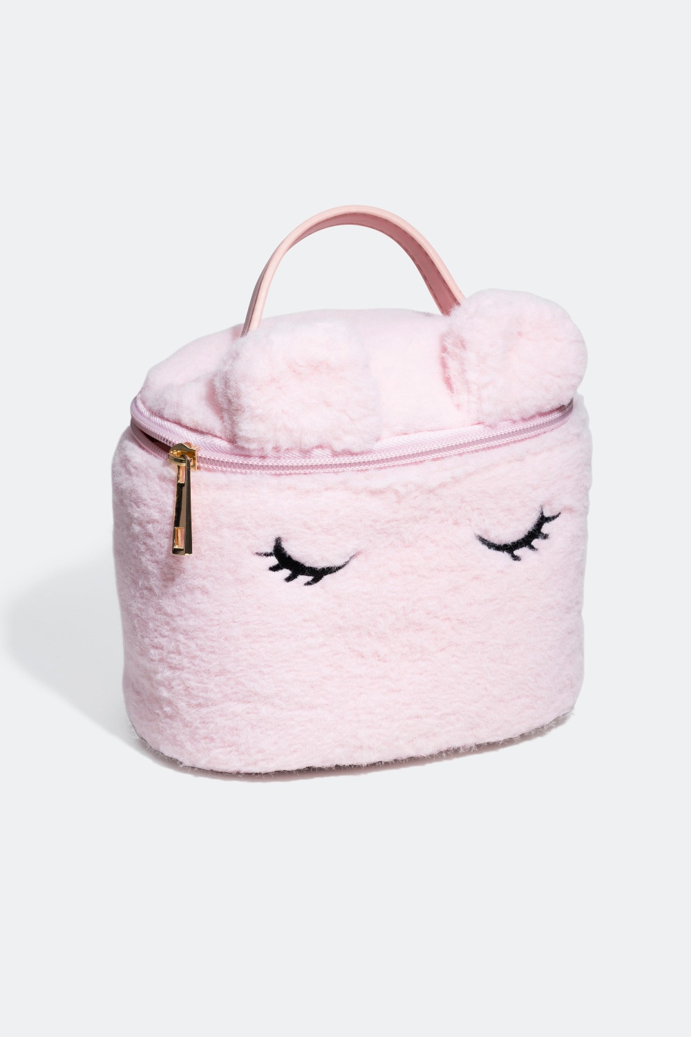 Veske med fluffy stoff og håndtak - Søt veske med fluffy, rosa stoff utsmykket med en illustrasjon i form av øyenfranser og to små ører. Vesken stenges med en rosa glidelås og har et håndtak.