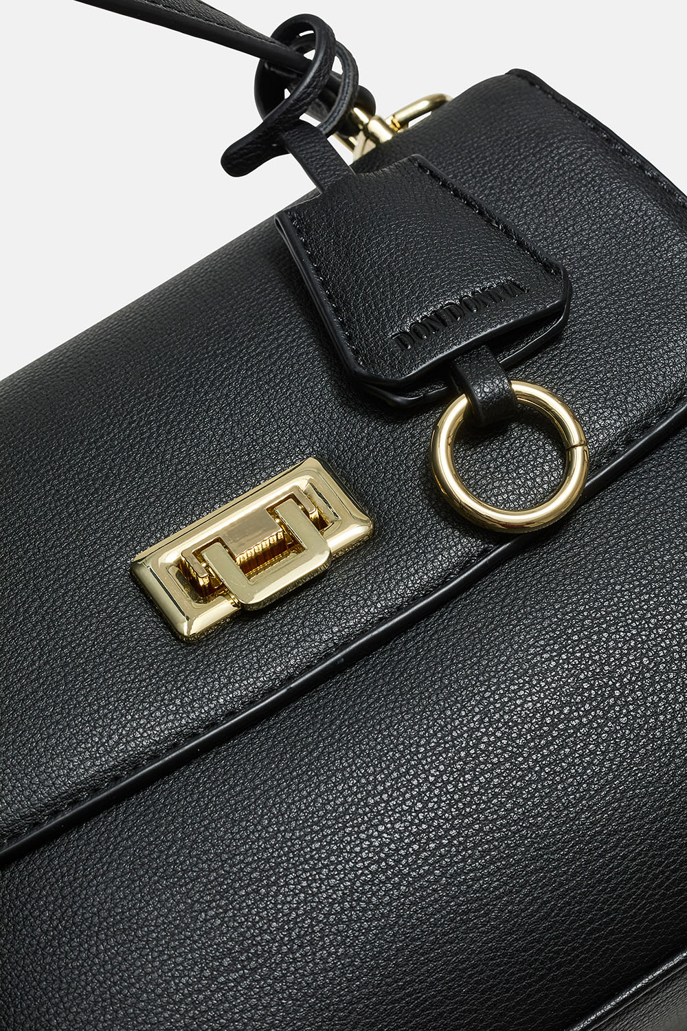 Veske i sort imitert skinn med gulldetaljer og Don Donna-logoen preget på baksiden. Vesken lukkes med metallspenne og glidelås, og har et mindre rom på innsiden som lukkes med glidelås. Vesken har justerbar skulderrem for at vesken kan brukes som crossbody.