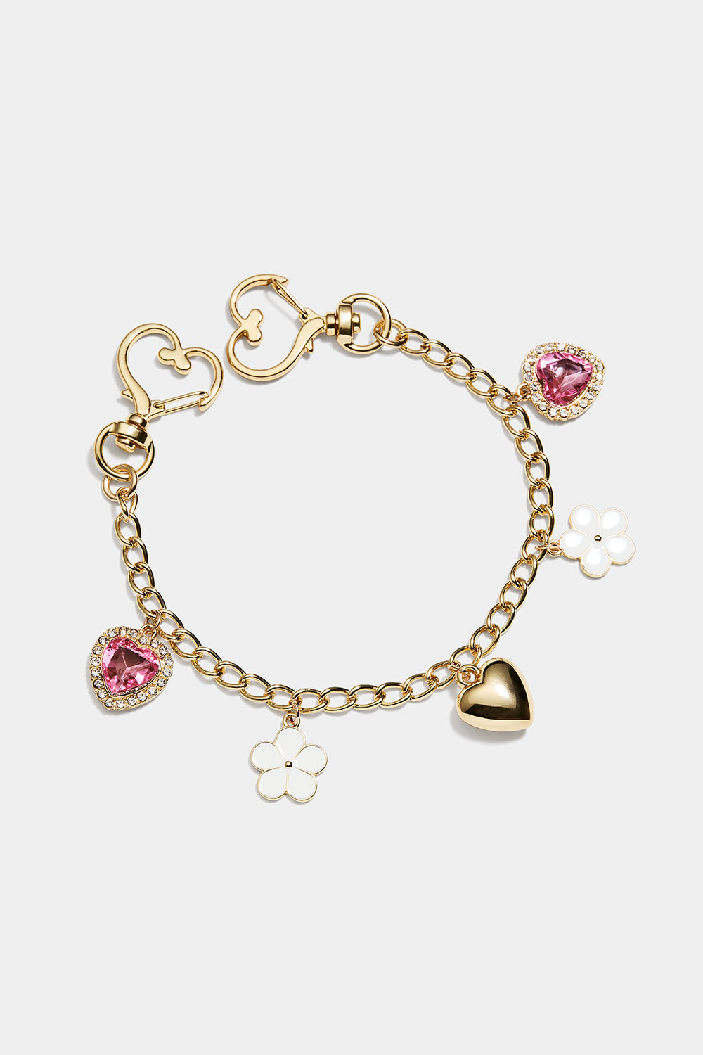 Nøkkelring med to hjerteformede spenner i hver ende av en lenke, dekorert med hjerter i rosa strass og hvite blomster.