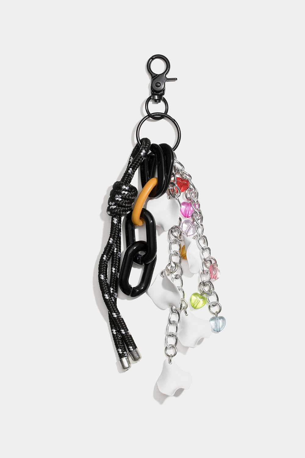 Nøkkelring dekorert med tau, plastlenker, metallkjeder og perler i forskjellige farger. Kan festes med nøkkelring og klolås.