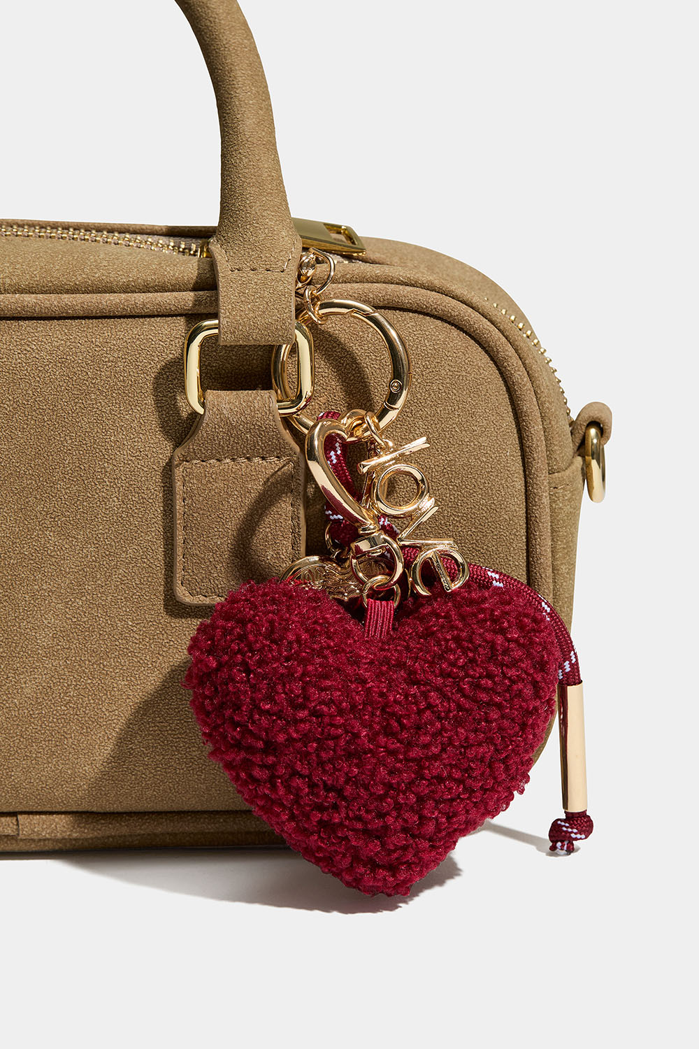 Nøkkelring med mykt, mørkerødt hjerte, tau og anheng. Kan festes med nøkkelring og karabinlås.