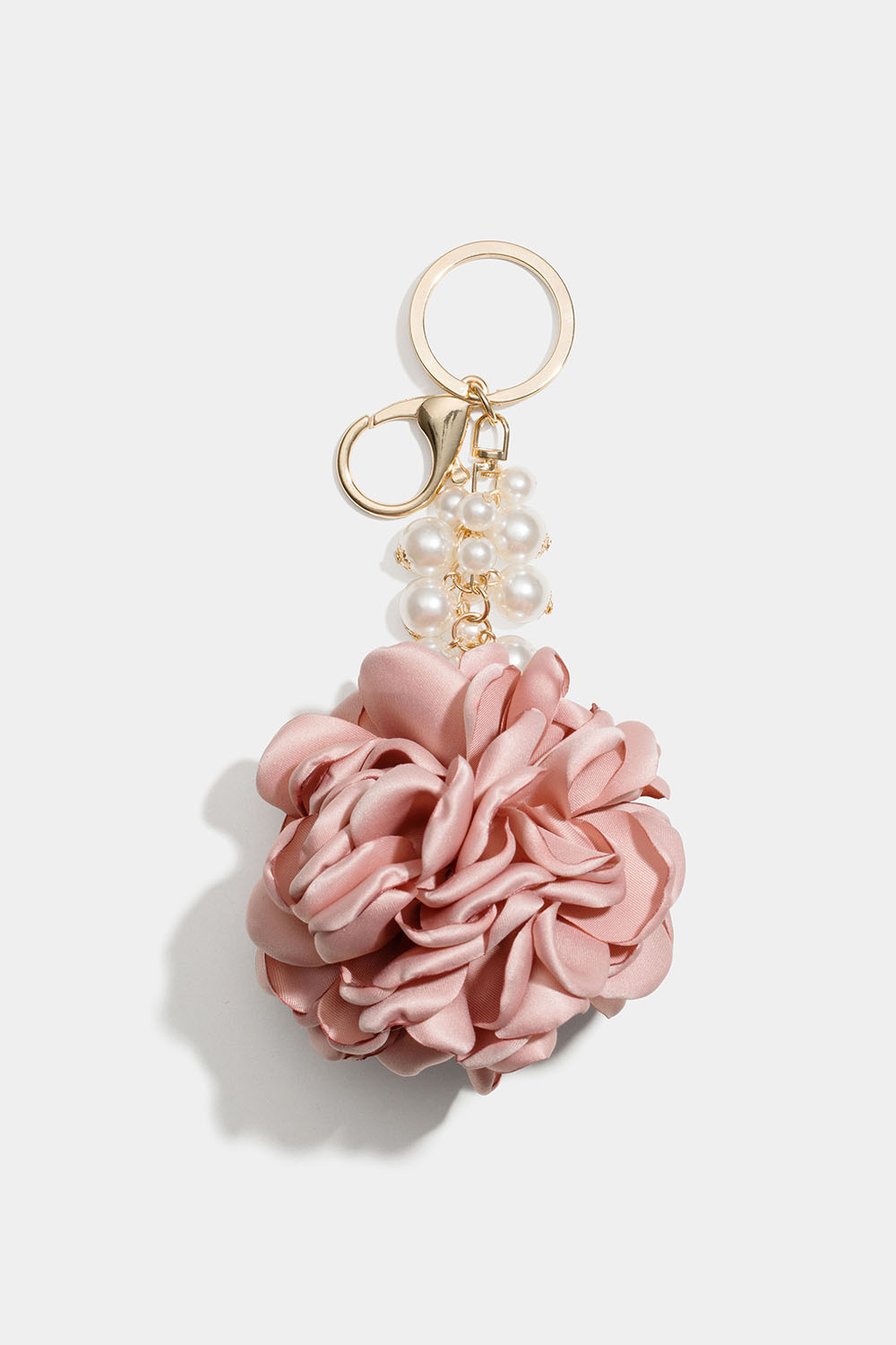 Nøkkelring med hvite perler og stor, rosa blomst i stoff. Kan festes med nøkkelring og klolås.