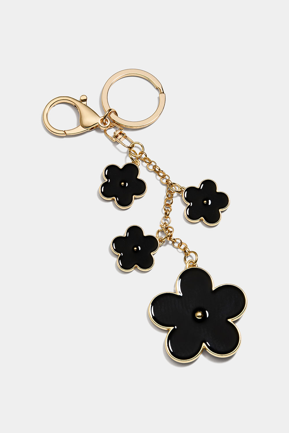 Nøkkelring med fire sorte blomster som henger på en lenke. Kan festes med nøkkelring og klolås.