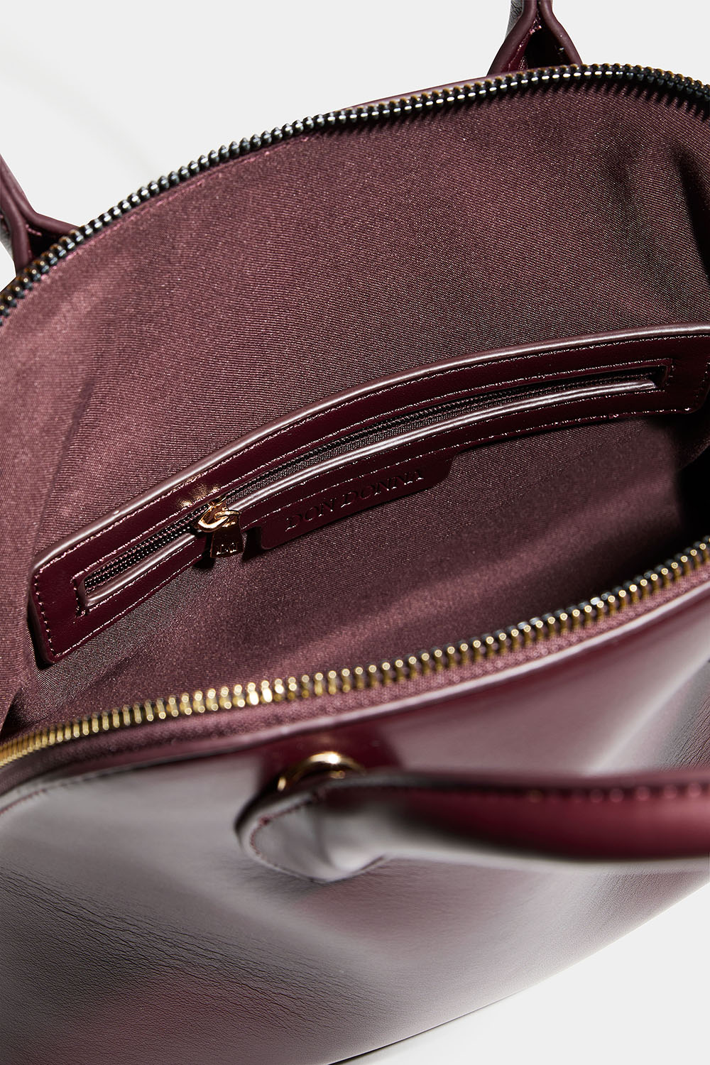 Bowlingvske i vinrødt imitert skinn med gulldetaljer og Don Donna-logoen preget på den ene siden. Vesken lukkes med glidelås og har et mindre ekstra rom på innsiden som lukkes med glidelås. Vesken leveres med en avtakbar skulderrem, slik at du også kan bære den over skulderen eller på tvers.