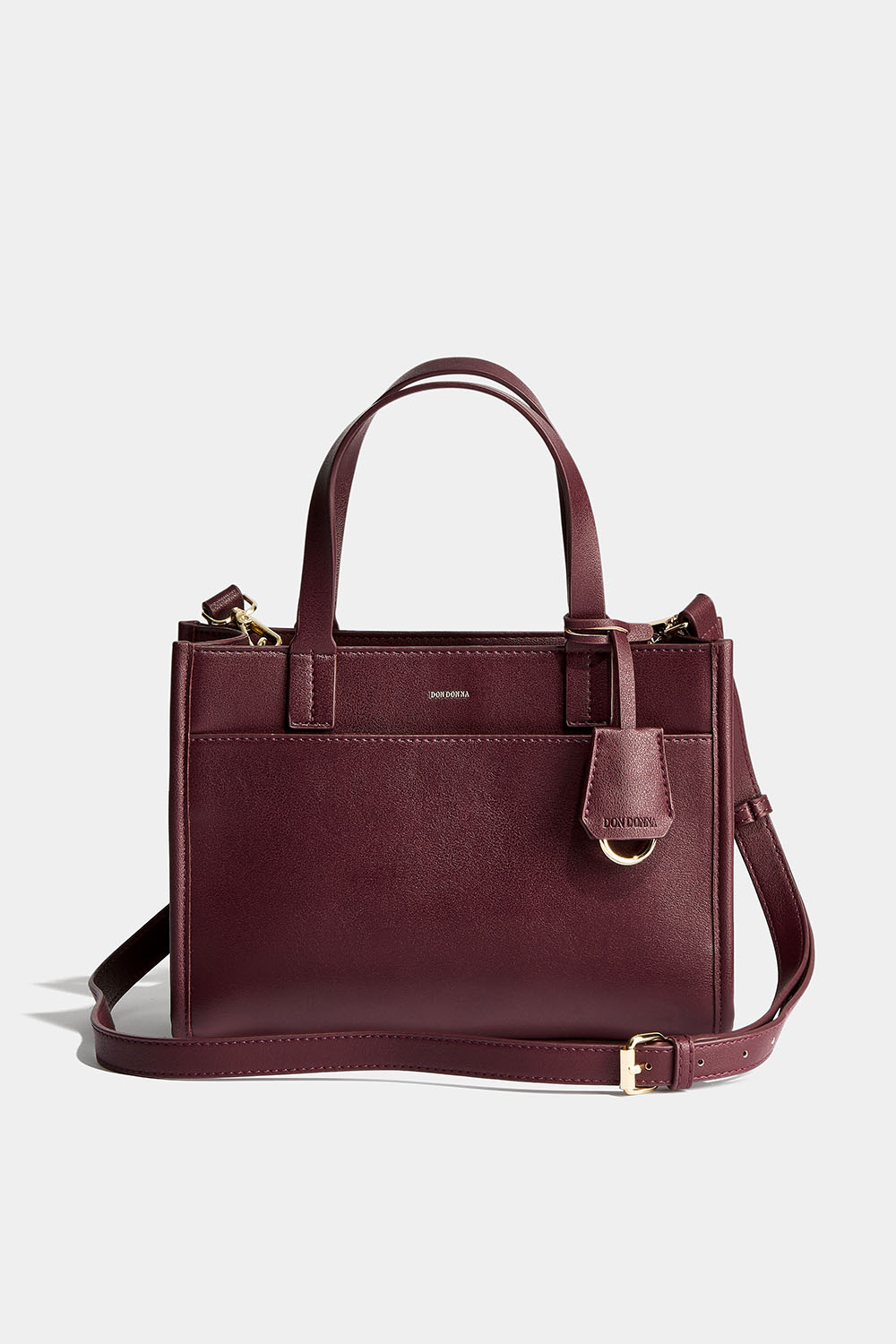 Vinrød veske med gullfarget Don-Donna-logo foran. Vesken har to håndtak og en avtakbar skulderrem. Vesken har et større rom som lukkes med glidelås, og to små rom inni. Skulderremmen er avtakbar og justerbar, slik at vesken kan bæres over skulderen eller som crossbody.