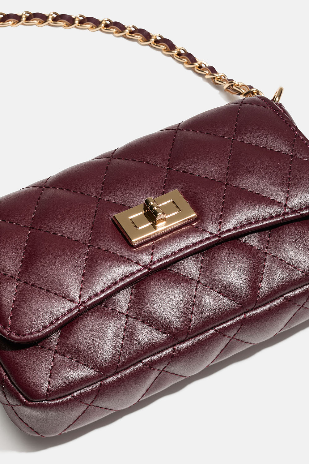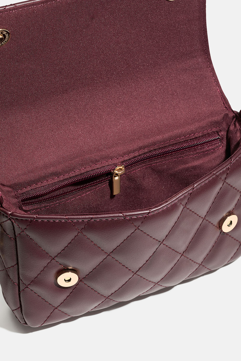 Liten rektangulær veske i burgunderrød vattert skinnimitasjon med lenkerem. Det store rommet lukkes med magnetspenne, og inni er det også et mindre rom som kan åpnes og lukkes med glidelås.